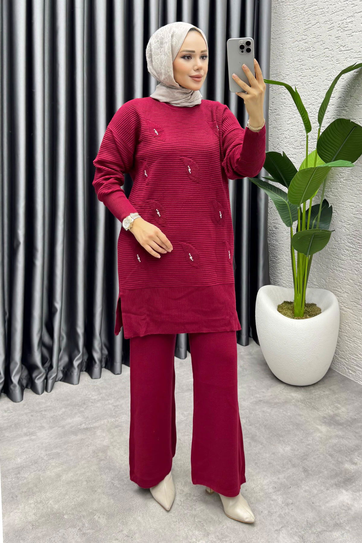 Eylül Taş Detaylı Triko Takım 1208 Bordo