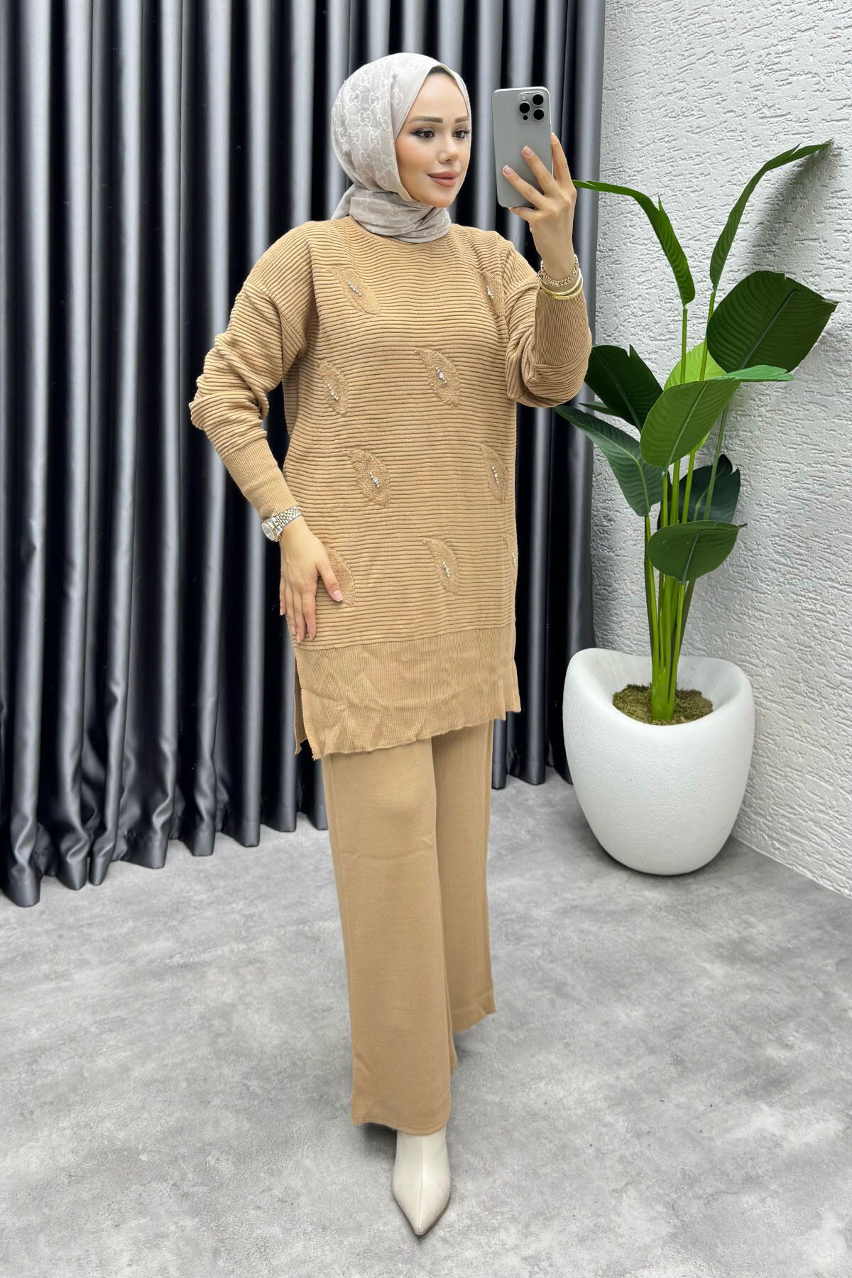 Eylül Taş Detaylı Triko Takım 1208 Latte