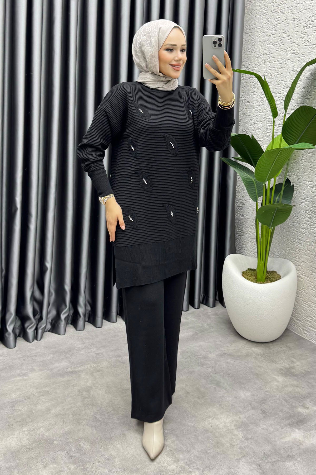 Eylül Taş Detaylı Triko Takım 1208 Siyah