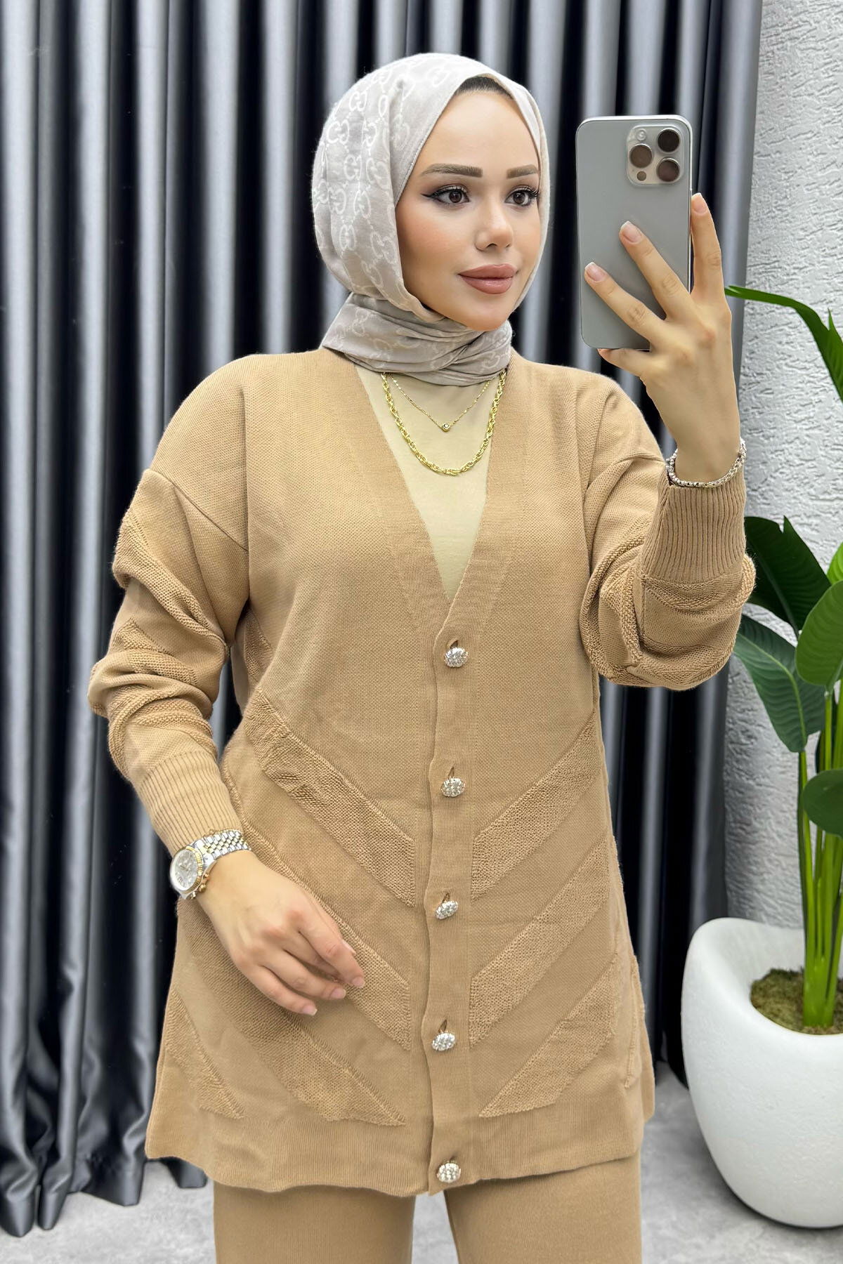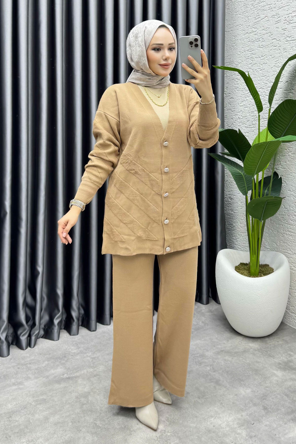 İdil Düğme Detaylı Triko Takım 1314 Latte
