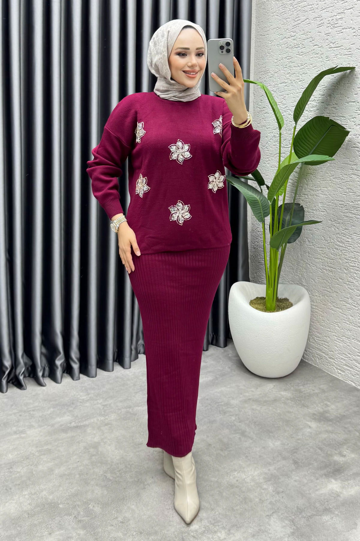 Irmak Çiçek Detaylı Triko Takım 1006 Bordo