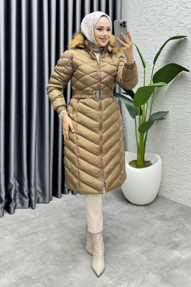 Kapüşonun kaliteli tüylü detayı, montun estetik görünümünü tamamlayarak sıcak ve şık bir görünüm sunar.