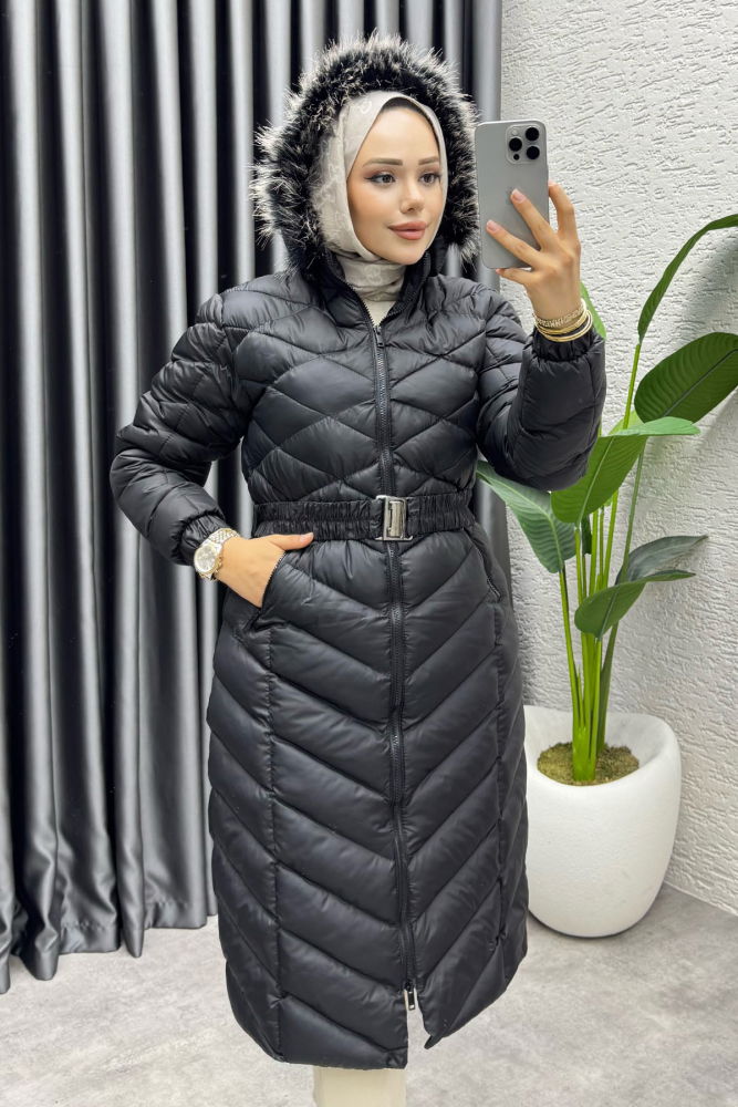Kapüşonun kaliteli tüylü detayı, montun estetik görünümünü tamamlayarak sıcak ve şık bir görünüm sunar.