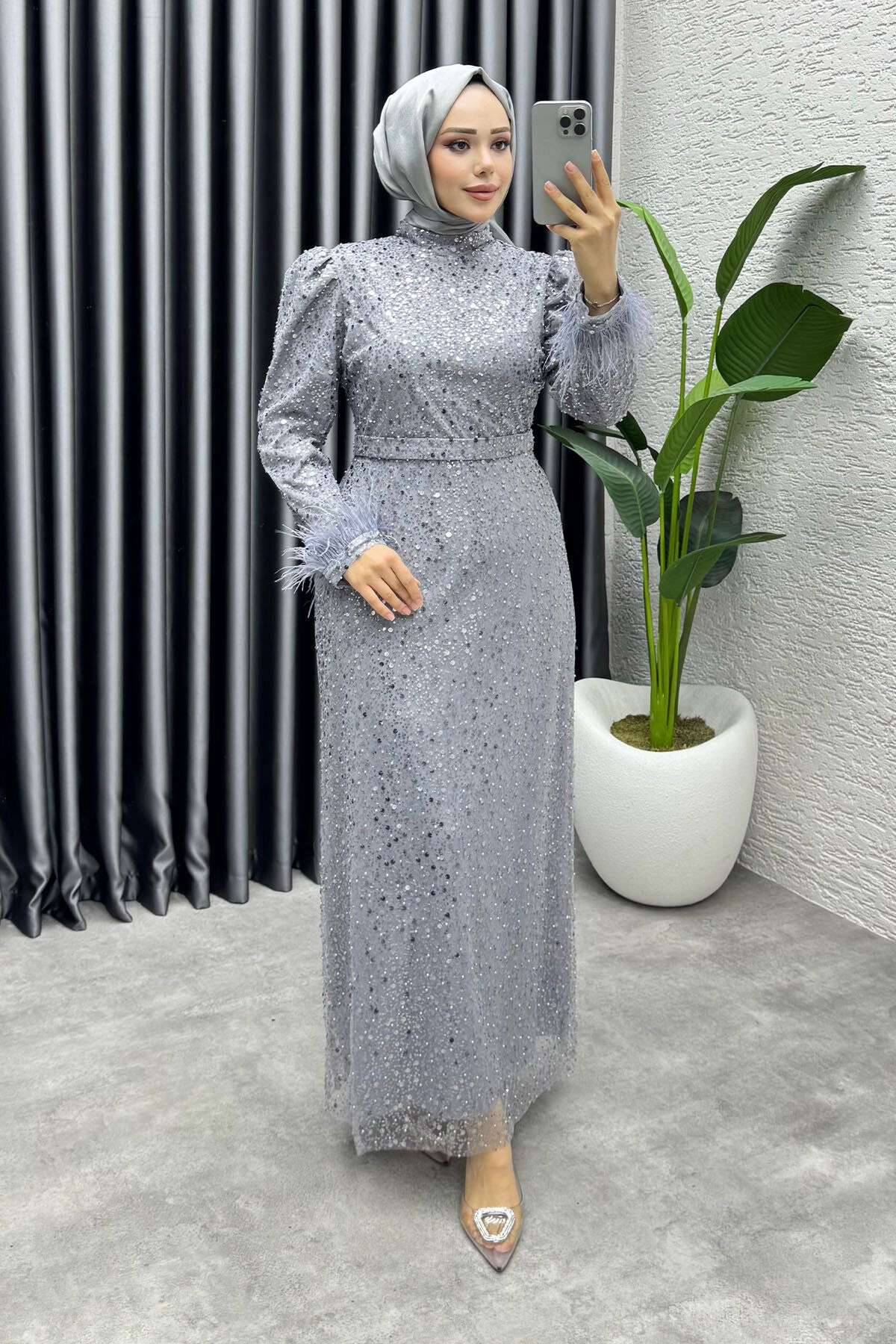 Kol manşeti otriş detaylıdır ve tüm tasarım full boncuk ve pul işlemeli olarak hazırlanmıştır; bu detaylar abiyeye sofistike ve ışıltılı bir dokunuş kazandırır.