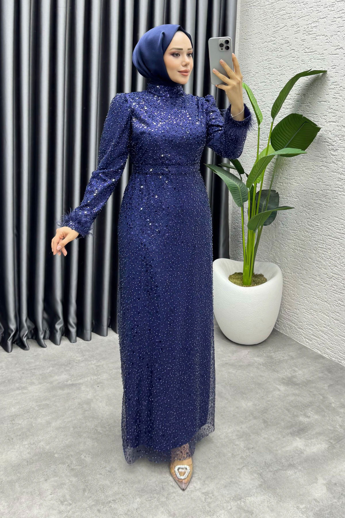 Kol manşeti otriş detaylıdır ve tüm tasarım full boncuk ve pul işlemeli olarak hazırlanmıştır; bu detaylar abiyeye sofistike ve ışıltılı bir dokunuş kazandırır.