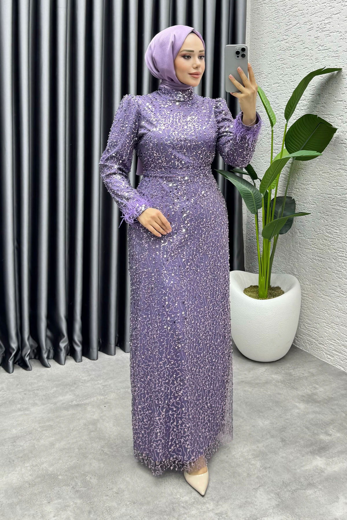 Kol manşeti otriş detaylıdır ve tüm tasarım full boncuk ve pul işlemeli olarak hazırlanmıştır; bu detaylar abiyeye sofistike ve ışıltılı bir dokunuş kazandırır.